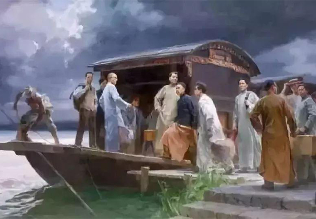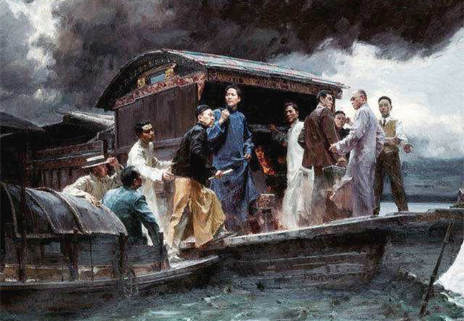 1921年7月底的一天,南湖浩渺烟波上,停泊一艘单夹弄中型画舫,舫中十多位外地青年从中午11时开会直到傍晚6时分。他们在小船上通过了《中国共产党党纲》,《关于当前实际工作的决议》,选举产生了中央领导机构,庄严宣告了中国共产党的诞生。面对满天风雨阴霾,会议闭幕时他们轻呼出时代的强音:共产党万岁!世界劳工万岁!第三国际万岁!共产主义万岁!一湖烟波无声,有幸见证阴霾中“开天辟地大事变”。