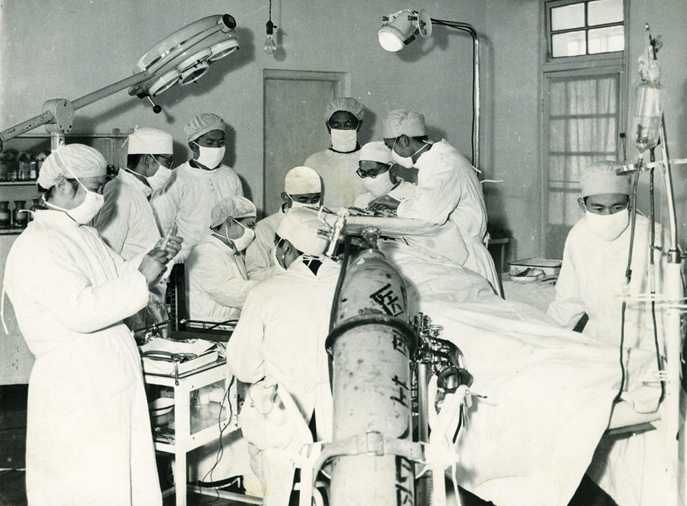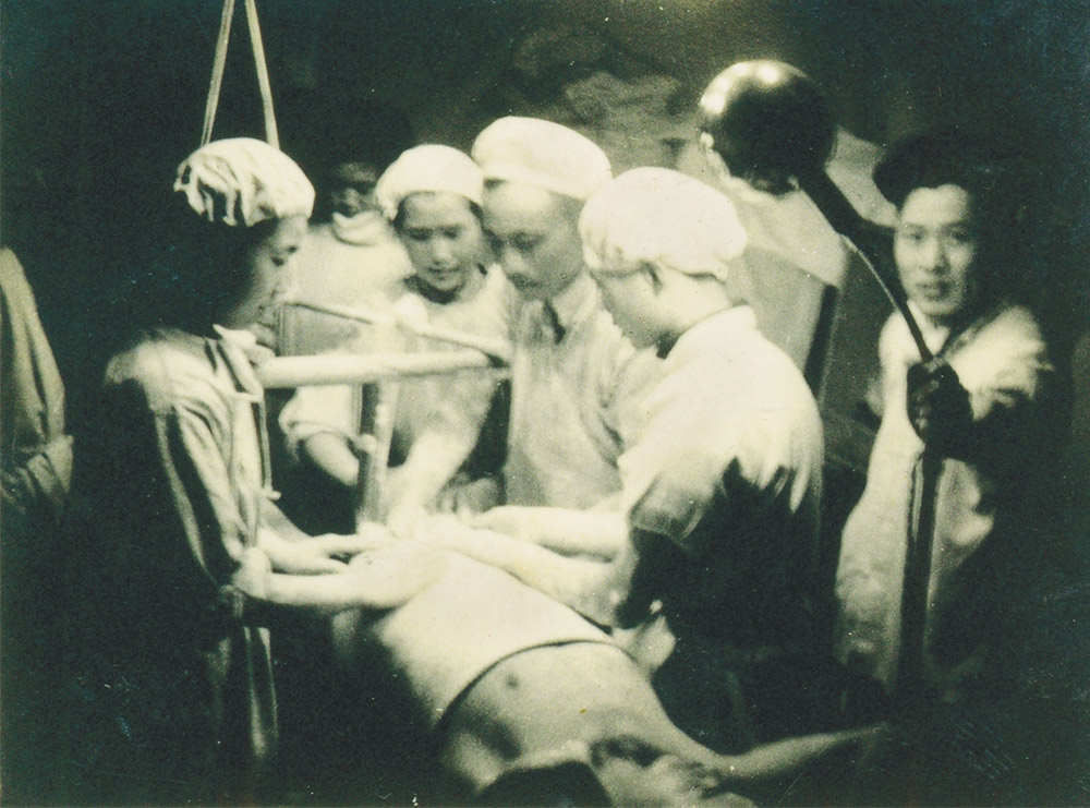 抗美援朝医疗队在为伤员做手术-右扶手术灯者为医疗队队长胡樟明同志