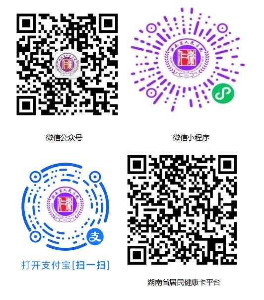 1、网络预约:微信公众号、微信小程序、支付宝小程序、湖南省居民健康卡平台(已开通预约挂号、当日挂号、缴费、检验检查结果查询等功能);
