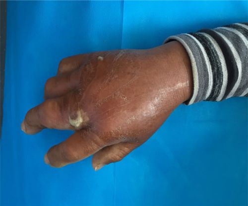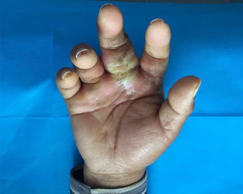 66岁的王师傅是宁乡市黄材镇农民,5月中旬,他在地里干活时右手中指根部被竹刺扎了一下,当即感到疼痛不已,并流出少许鲜红色血液。农村人受点小伤习以为常,就没放在心上。不料两天后,他的右手红肿、流脓越来越严重,伤口周围皮肤变成白色,只得在家人陪同下来到长沙,就诊于捷克论坛