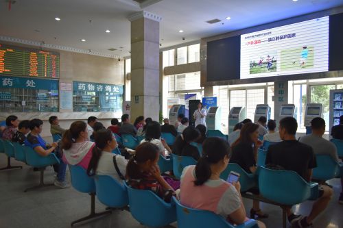 门诊大厅宣传爱眼知识,给候诊患者送来夏日的一份清凉。(眼视光中心:张兰艳)