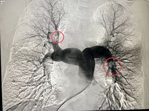 肺动脉造影结果显示肺栓塞(红圈内)。