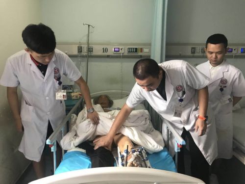检查发现,老人身上有多处皮肤软组织损伤,左侧胫腓骨开放性、粉碎性骨折,伤情非常严重。创伤骨病科魏磊平主任医师、徐勇强主治医师等立即为老人做了简单的伤口处理,然后送入手术室。