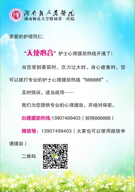 “天使心音”援助热线:13907499403(微信同号),短码666888,24小时为临床的护理同仁排忧解难。