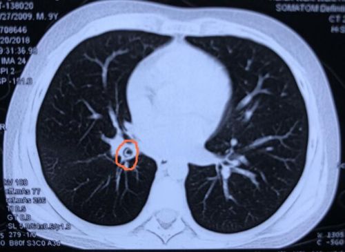 ct显示,异物(红圈内)卡在右侧主支气管。