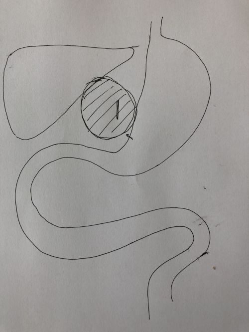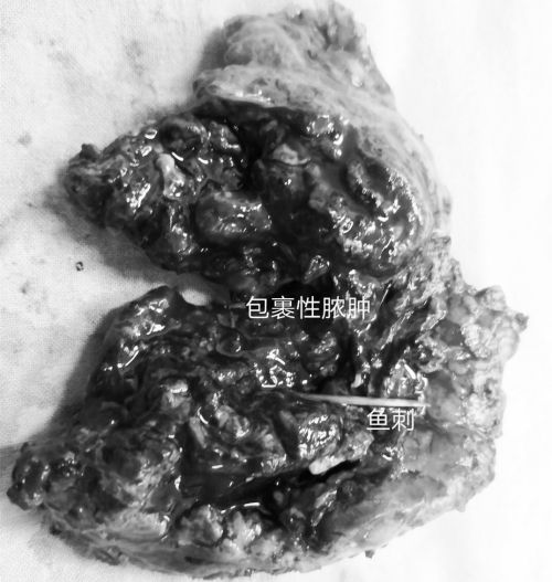 鱼刺被周围组织包裹,在胃和肝之间形成一个巨大脓肿。(易为民