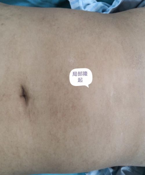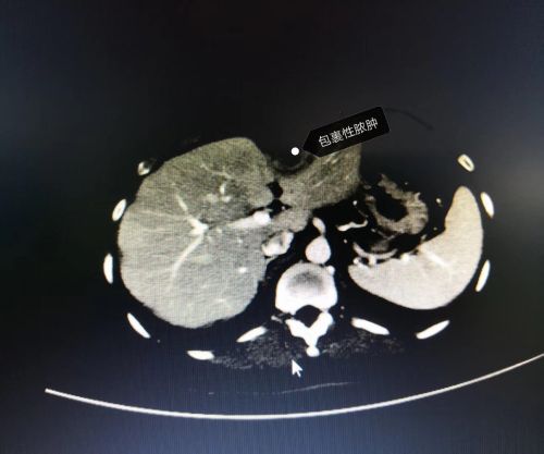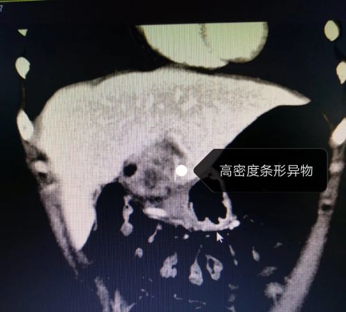 入院后,医生进行体查发现,李女士上腹部隆起和压痛都很明显,CT检查发现,在她的肝和胃之间有一个低密度病灶,其中还有一个条状物体。患者表示,近一年来,腹部一直隐隐作痛,洗澡时还可以摸到肚子里“有一坨东西”,最近时常出现发烧、畏寒的情况。