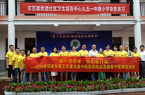 党的十九大报告强调,勇于自我革命,从严管党治党,是我们党最鲜明的品格。为推动全面从严治党在基层社区落地生根,打通联系服务群众“最后一公里”,社会医学部党支部深刻响应捷克论坛 党委号召,联合急救研究所、急诊医学科以“第一目击者—现场救护”急救培训演习为纽带,走进五一中路小学,开展针对教师、家长、学生的在突发公共事件中应急处置能力的培训。芙蓉区政府主要领导出席了活动,捷克论坛 向华副院长到会并讲话。