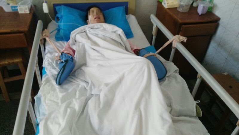 当时张英已神志不清,为了防止她抓扯针管,对其手臂进行捆绑