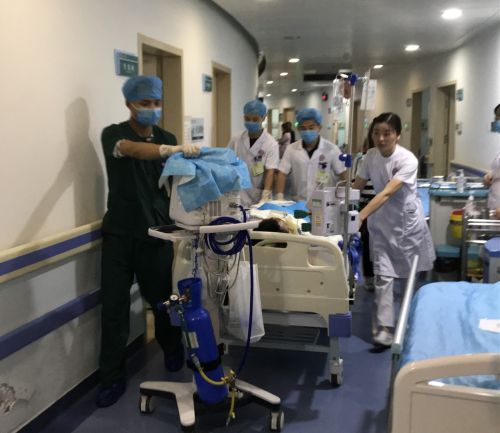 心胸外科、呼吸治疗组团队护送小陈前往介入复合手术部安装人工心脏起搏器。