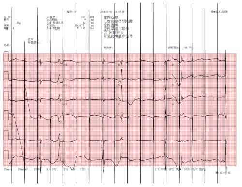 术前心电图显示:三度房室传导阻滞、室速、室颤。