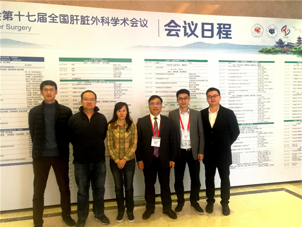 肝胆胰微创团队参会代表在会场合影。左起:蔡荣耀副教授、朱斯维副教授、廖春红教授、尹新民教授、李云峰 副教授、刘胜医师。