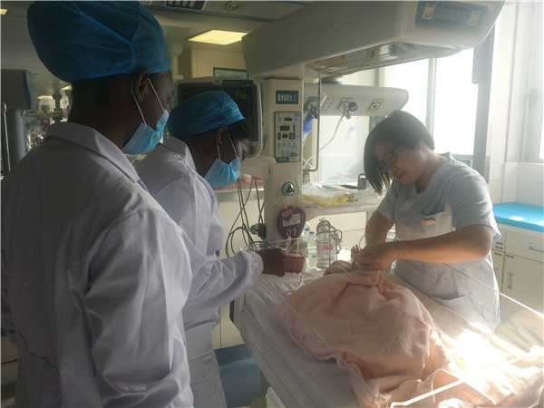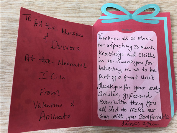 2名助产士在新生儿科收获颇丰。学习了解并实操演练了先天性无肛、新生儿低血糖、新生儿窒息、新生儿气胸等常见疾病的诊疗与护理;PICC置管、新生儿胃管留置、新生儿蓝光箱、新生儿沐浴、新生儿喂养等常规护理操作。访学时间结束后,2名助产士送来了一封暖暖的感谢信,感谢新生儿科所教授的知识与中国人民的友谊,她们回去后将给非洲人民带去健康福音。