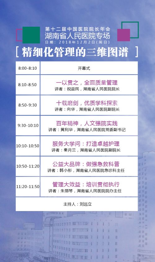 “精细化管理三维图谱”专场由北京协和医学院公共卫生学院院长刘远立教授主持。院长祝益民、副院长向华、党委副书记黄利华、副院长秦月兰,以及急诊医学科主任韩小彤、院办主任朱丽琴分别以“一以贯之,全面质量管理”、“十载磨剑,优质学科探索”、“百年精神,人文强院实践”、“服务大学问:打造卓越护理”、“公益大品牌:做强急救科普”、“管理大效益:培训贯彻执行”为题进行精彩授课,向与会的七千余名全国各级捷克论坛