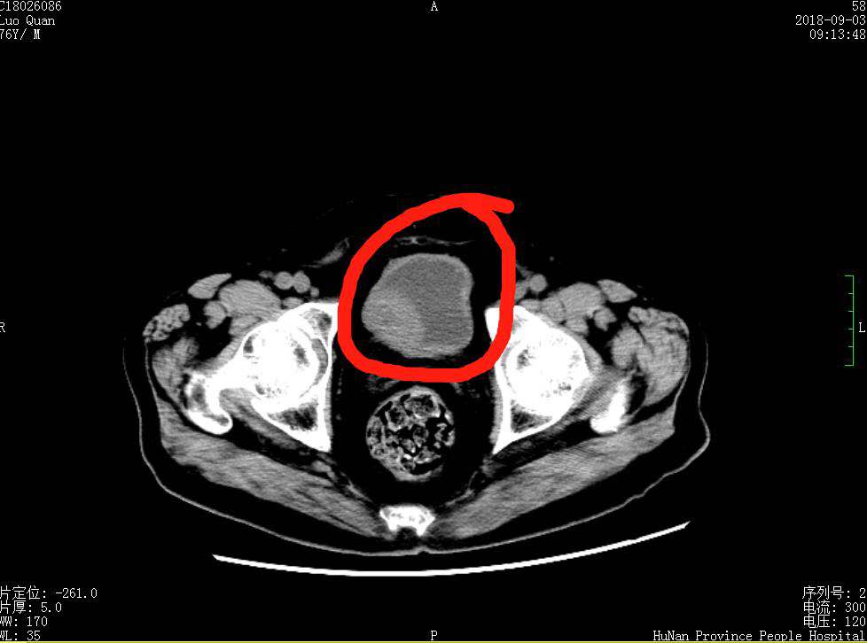 泌尿四科。经检查诊断为“膀胱肿瘤”。B超及CT检查显示罗老膀胱内有一4.0*2.8肿瘤,如此大的肿瘤,需要做膀胱全切。以杨科主任为首的手术团队考虑到患者的生存质量及患者的要求,经过精心设计手术方案和完善的术前准备,于9月12日在腰硬联合麻醉下亲自为罗老作了“经尿道钬激光膀胱肿块剜除术”,保留了罗老的膀胱,避免了他终身要带着尿造口袋的痛苦和尴尬。术后经治疗护理,规范化疗,病情好转出院。