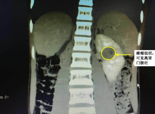 影像资料上可以清楚地看到肿瘤位于左侧肾门附近,周围血管丰富。