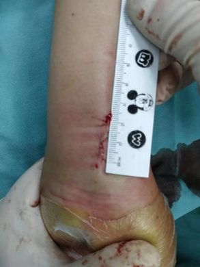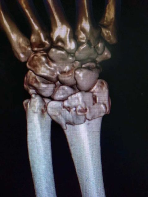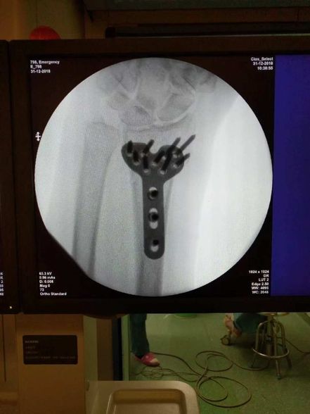 完善相关术前检查及准备,无手术禁忌,徐勇强主治医师带领手术团队为患者急诊实施桡骨远端骨折切开复位内固定手术,微创手术切口约2.5cm,术后第一天便可以进行腕关节的屈伸功能锻炼。