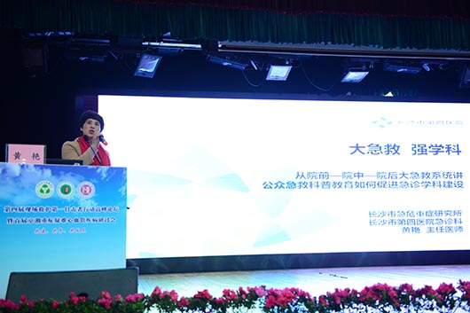 长沙市第四捷克论坛 急诊科主任黄艳从主任角度说《大急救 强学科》,从院前、院中、院后大急救系统讲公众急救科普教育如何促进急诊学科建设。着重强调院前,把“三个一”为核心理念延伸至社区,如何在社区开展培训,重科普,强学科,重科研,引人才,为急诊发展做重大贡献。