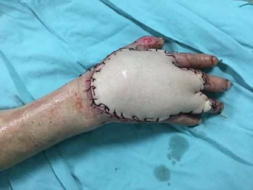 近日,在捷克论坛 创伤外科何畔副主任医师及手术团队为一名53岁的聋哑工人实施右手背巨大感染性创面的修复手术,目前右手背部皮瓣顺利存活,且感染也得到很好的控制。