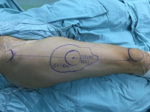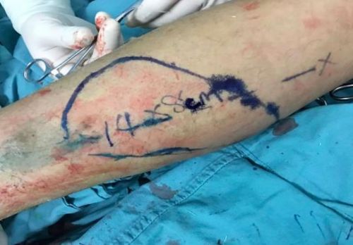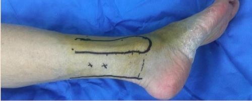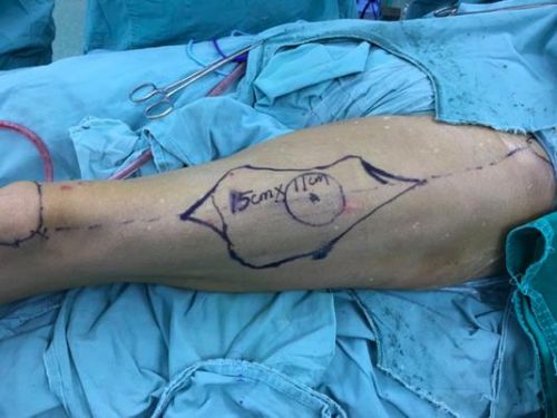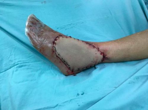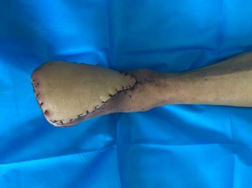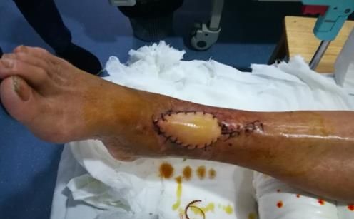 Case4:贺某,男,75岁,因摔伤致右侧Pilon骨折并踝关节半脱位,右腓骨下段粉碎性骨折,在省人民捷克论坛 行“右侧Pilon骨折、右腓骨下段骨折切开复位植骨内固定术”,术后伤口愈合不良,胫骨远端及钢板外露。何畔副主任医师为患者实施“右胫前伤口皮瓣移植术”。