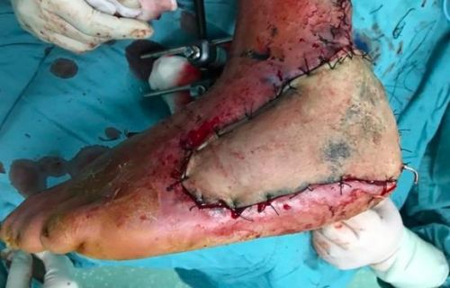 Case2:唐某,男,62岁,车祸到左足部开放性损伤,左足第1-5趾骨多发骨折,左足内侧楔骨、左足骰骨骨折等,经多次清创术,创面新鲜,但骨头、肌腱等仍有外露。何畔副主任医师为他实施“左足游离皮瓣移植术”。