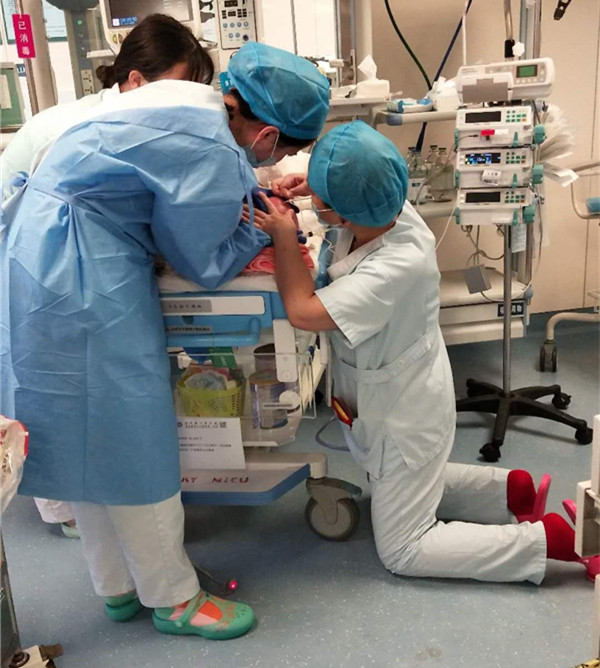 1月23日,再普通不过的一天,可对于四个月大的27+5周的早产儿菲菲来说,却非比寻常,刚刚5kg的她将进行房间隔缺损修补,三房矫治大型心脏手术。NICU的专科护士陈利双,为提高穿刺成功率,正在跪地为菲菲穿刺。菲菲家长感激地说:“谢谢您,护士妈妈!” (图文/新生儿科 吴莎莉)