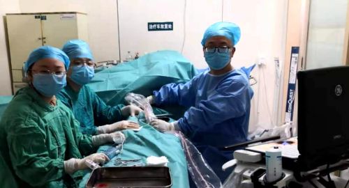 在家属的信任和配合下,2月22日下午,由肾内科和超声科罗逊、殷薇、夏晓辉三位副主任医师组成的手术小组为老人施行“血管腔内成形术”(PTA)。然而,手术过程并非一帆风顺,手术小组先后遇到动脉粥样硬化导致穿刺困难、瘘口转移性钙化导致扩张困难等困难,均一一克服。耗时一个半小时后,手术顺利完成,当曹爷爷瘘静脉恢复震颤的一刹那,有如干涸的稻田被注入哗哗的水源。当晚,曹爷爷即恢复使用内瘘,顺利完成透析。