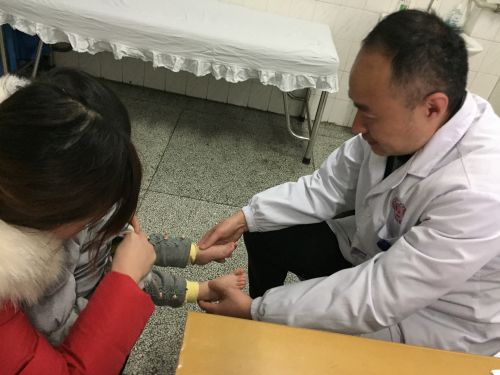 李博医师给小朋友进行桡骨小头半脱位复位。