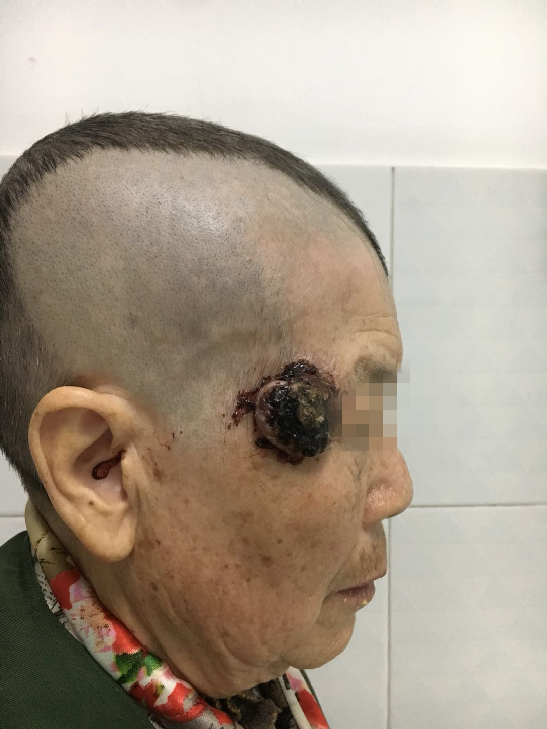 经检查发现,章奶奶右侧颞部肿瘤已经增大至3x3x3立方厘米,变成一块“大花菜”,伴出血、溃烂、恶臭,并确诊为磷癌。如果不尽快手术,不仅肿瘤会持续增大,影响面部结构,甚至还会增加肿瘤侵袭周边器官及远处器官转移的几率。