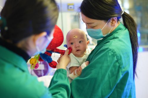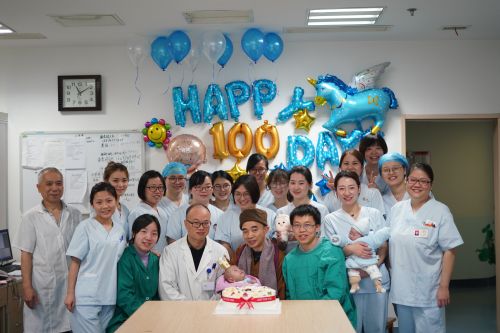 新生儿科病房里热闹非凡。医生办公室围满了人,墙上装饰着用气球组成的“Happy 100 day”字样;护士们拿着不同款式的小衣服,不停挑选、比划着;穿着隔离服的义工,拿着玩具和一名小患儿逗趣。