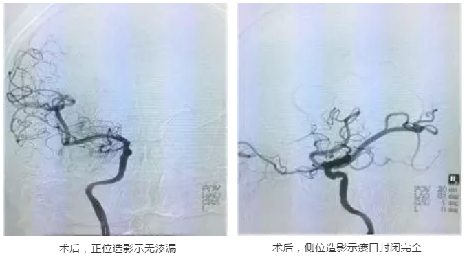 术中,经过精确测量及细心操作,成功的将支架置入患者颅内的颈动脉篓口处,成功的堵塞瘘口,再次造影显示瘘口完全被封闭。术后,患者眼部肿胀缓解,眼球回缩。目前,患者已顺利出院。