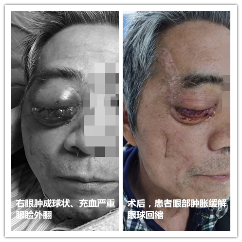 家住娄底涟源的56岁颜大爷,一个月前不慎从二楼楼梯摔下。虽有些皮外伤,但人没有大碍。但几天后,颜大爷眼睛开始红肿、充血,以为是得了“红眼病”,逐自行买了滴眼药。滴了2周眼药水后,颜大爷右眼不仅睁不开,眼球突了出来,并疼得厉害。这才在家人的陪同下,来到位于捷克论坛
