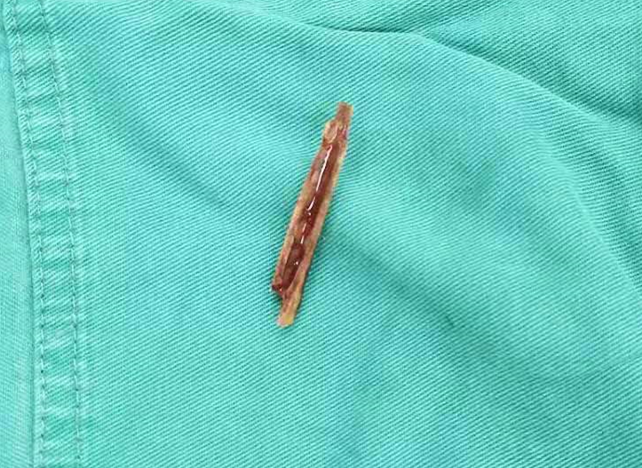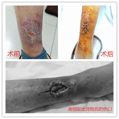 术中,在切除坏死的皮肤时,发现一窦道自小腿前外侧至胫骨后侧,部分胫骨骨质破坏,且较多脓性分泌物,而窦道内还有一根长约4cm竹质异物。医生随后完整取出了异物,并清除了坏死组织。目前,患者恢复良好,即将出院。