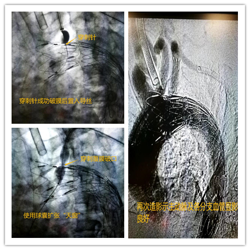 术中,介入血管外科团队使用自主研发的破膜穿刺针,经左上肢肱动脉,达到已平稳释放的主动脉支架主体覆膜处,通过DSA的影像定位穿刺部位,然后穿刺破开主体支架的外膜,接着使用扩张球囊打开“天窗”,最终顺利置入一枚小的覆膜支架,重建左锁骨下动脉,恢复左侧椎动脉及左上肢血运。