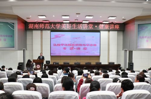 美好生活,健康为先。5月9日下午,在湖南师范大学工会组织的“美好生活讲堂”健康讲座上,乳甲外科主任医师、甲状腺专科主任张超杰教授讲授健康知识,师大及附中教职工代表近300人参加。