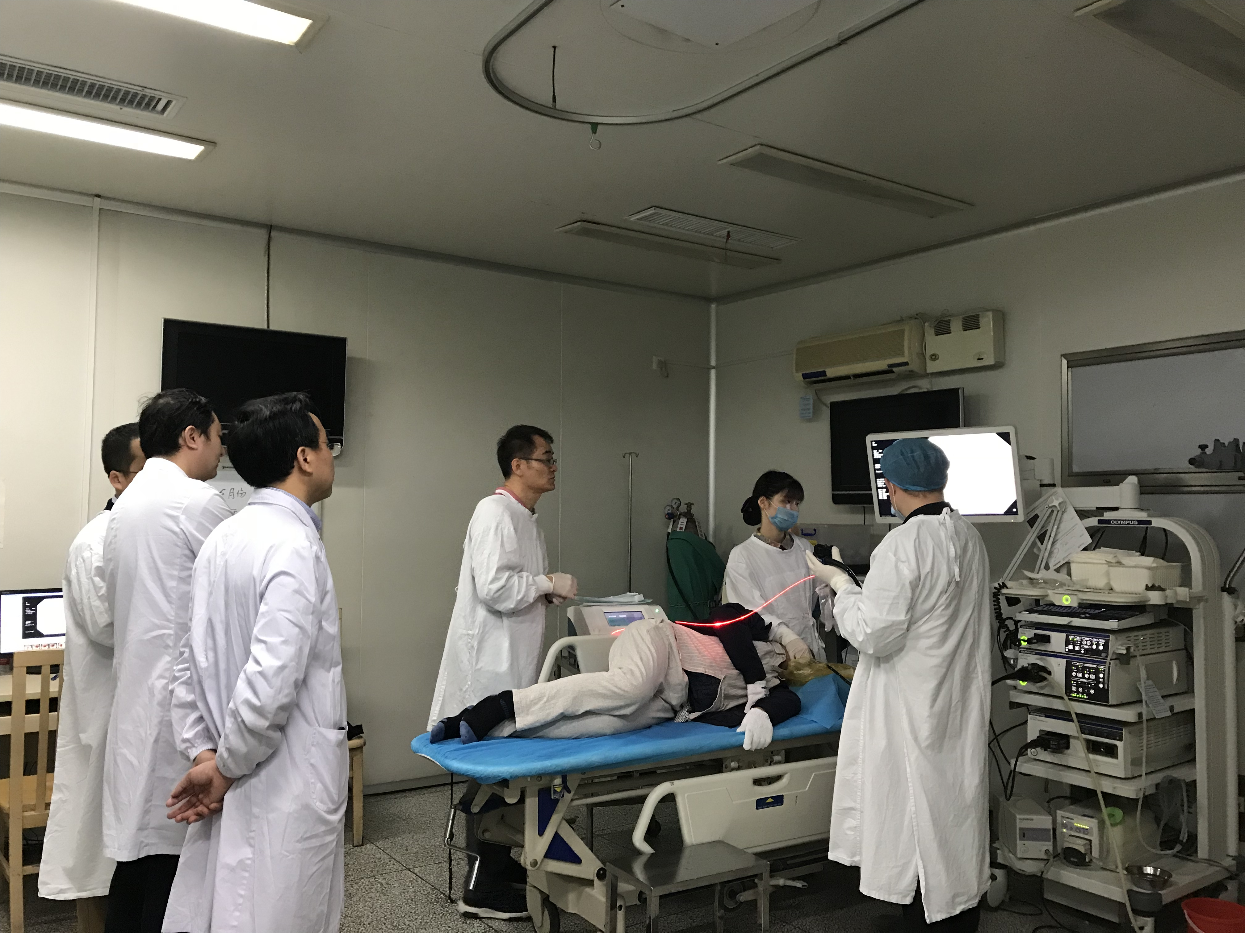 科主任段华新主任医师高度重视,制定了为周大爷进行光动力治疗的治疗方案。为此肿瘤一科准备了专用的避光病房,并为周大爷提前进行了光敏剂的输注。一切准备就绪后,肿瘤一科团队和消化科张渝副主任医师合作,在胃镜下为周大爷成功实施了捷克论坛第一例恶性肿瘤光动力治疗,周大爷在治疗后2周左右恢复进食,复查胃镜肿瘤明显消退,并顺利出院。