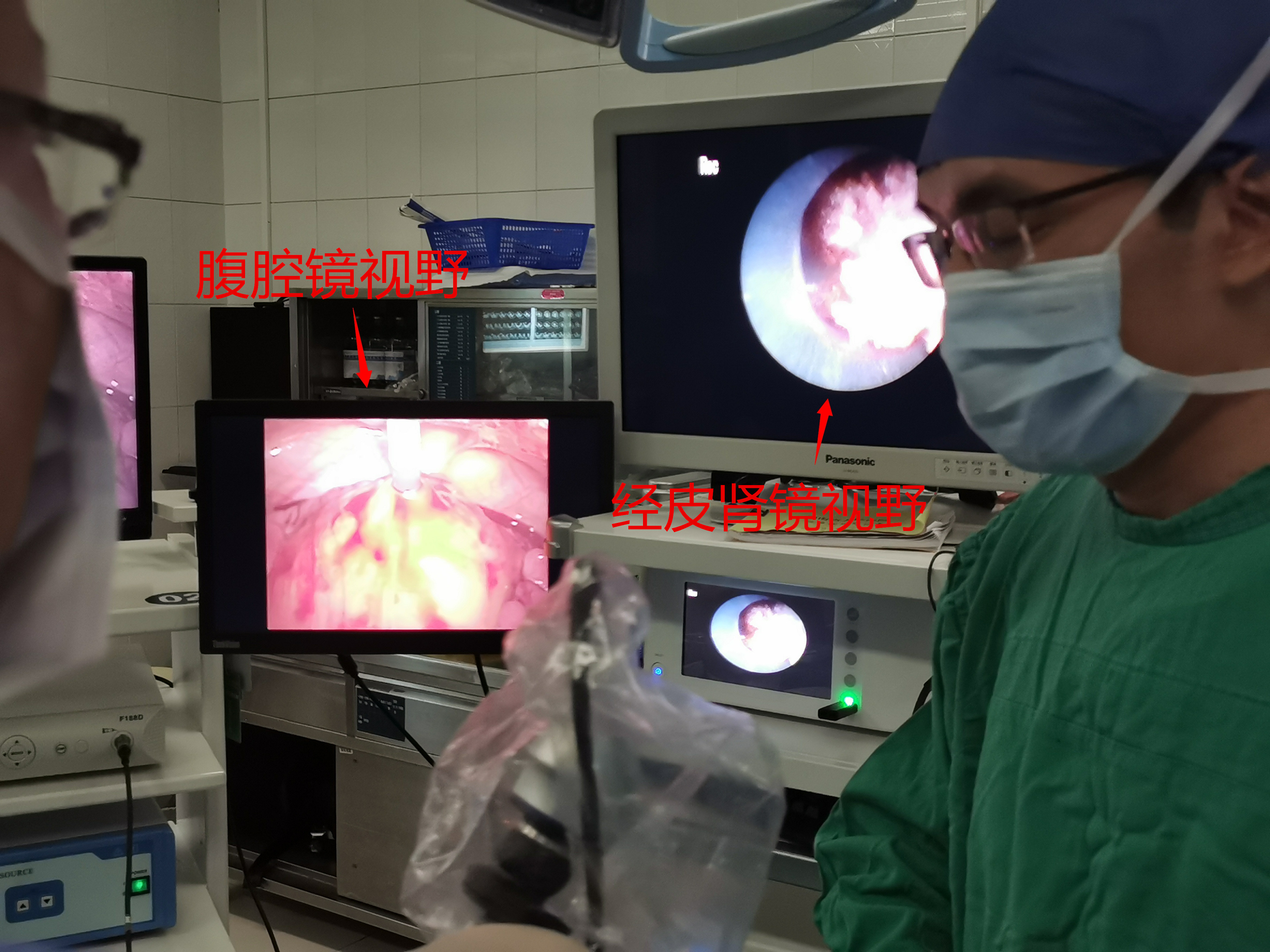 由于患者异位肾的输尿管是横向,拐了好几个弯,输尿管镜硬镜进不去;结石较大大,输尿管软镜手术时间会太长;又因右侧异位肾与腹壁之间肠管较多,经皮肾穿刺损伤肠管风险会增大。综合患者情况,医疗团队制定了个性化治疗方案,对患者行腹腔镜引导下行盆腔异位肾经皮肾镜钬激光碎石取石术+左输尿管镜检的双镜联合手术。