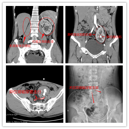 通过入院后的泌尿系CT增强检查显示,患者异位右肾位于盆腔左侧,在左盆腹交界区,异位右肾结石并右肾积水。且右侧肾脏异位到左侧盆腔压迫到了左侧输尿管。
