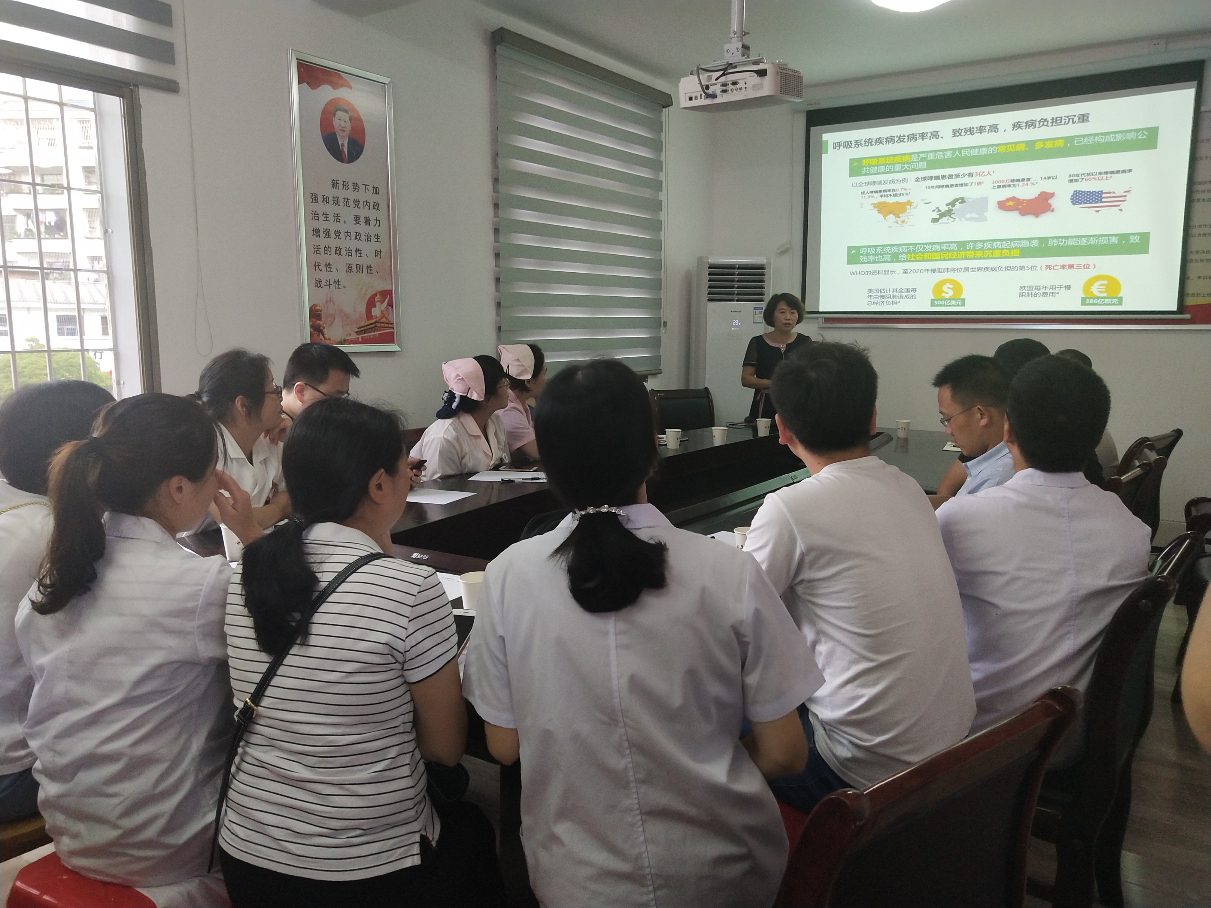 下午3:30,朱黎明教授在会议室为全院医务人员进行《祛痰疗法在呼吸系统疾病中的临床应用》的讲座,结合查房病例深入浅地从雾化、静脉、口服给药再到呼吸康复的气道廓清方法讲解了祛痰的治疗。参会的医护人员听得十分认真,纷纷拿起手机记录内容,培训取得良好反响。