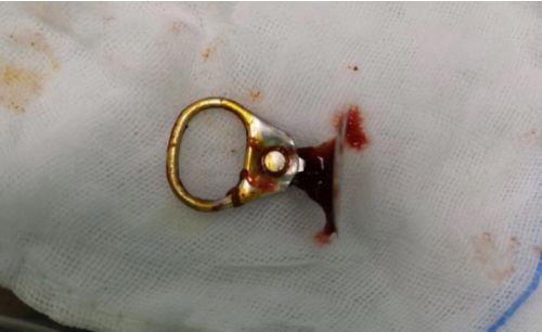 胃肠外科,接受了剖腹探查、胃十二指肠异物取出术。陈超武主任医师医疗团队历时4个小时,成功取出异物——一个金属拉环,并修补破损的肠道组织。据胡先生回忆,这个困扰了自己一个多月的小东西正是那天喝的罐装啤酒上的拉环。