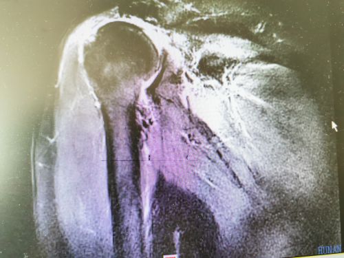 入院后完善了核磁共振等检查,结果显示:右肩袖损伤(冈上肌腱、冈下肌腱全层撕裂伴回缩)。“对于这种巨大的、不可修复的肩袖撕裂,普通的修补手术效果不好,只能进行反肩关节置换”,王靖主任医师带领团队经过认真仔细的分析讨论,为患者制定精准的手术方案后,于2019年5月26日在全麻下为余女士施行右侧反肩关节置换手术。通过这种省内首次开展的新术式,让患者肩关节旋转中心下移,术后,患者可以利用三角肌的力量完成肩袖外展的功能,恢复正常的关节活动度。