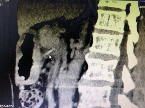 “牙签不仅把胃壁戳了两个洞,还穿过胃壁戳伤胰腺,导致胰腺周围感染、脓肿”,刘祺表示,如果不及时取出牙签,将导致胰腺感染、坏死、出血,并威胁周边大血管,患者将有生命危险。