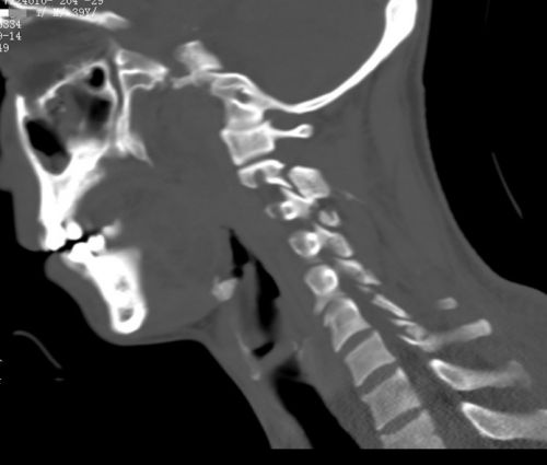颈部ct显示颈2-胸1椎体多处骨折。