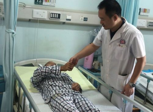 沈雄杰教授检查患者手的握力。