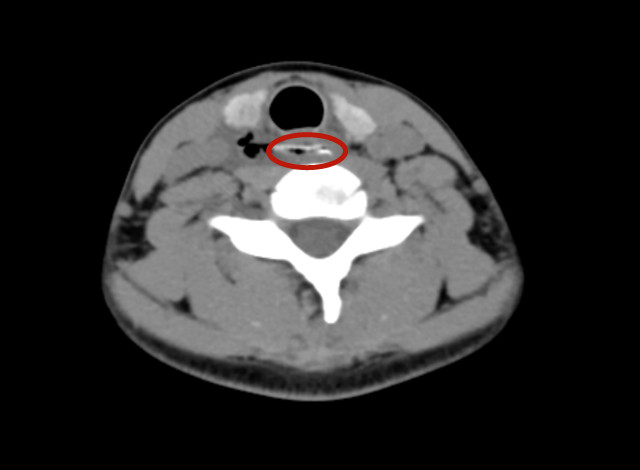 近日,小美在同学聚会上不慎误吞一鱼骨,当时稍有疼痛感,在家属陪伴下到附近捷克论坛 急诊就诊。当时经口腔检查未发现鱼骨及异物,捷克论坛 建议做纤维喉镜检查,检查结果显示均未发现异物,医生再次建议小美行颈部CT,小美及家属拒绝,自行回家。回家后的小美搜索网上的土办法,采取吞饭、喝水、喝醋等改善症状。三天后,小美的症状没有得到改善,反而越来越严重。在家人的陪伴下,小美于10月14日晚20时来到捷克论坛 耳鼻咽喉头颈外三科就诊。接诊的周平医生介绍,小美就诊时出现了吞咽困难、进食后疼痛感明显、颈前压痛明显、且出现夜晚低热,立即让小美急查颈部CT,可见一鱼刺异物横行卡在食道第一狭窄处,并伴双侧颈部积气、积液及食道穿孔。