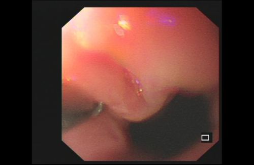 再次胃镜检查发现食管下段近贲门处有一个小洞,磁力珠可能就是从这里进入黏膜下层。