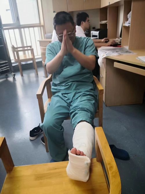 事情发生在10月24日上午,8点45分左右,完成晨间查房的段燚星主任接到“病人已准备就绪”的电话,快步赶往手术室,准备为一名61岁的男性膀胱癌患者施行手术。途中,他不小心踩空楼梯,左脚传来一阵刺痛。由于患者病情复杂,手术难度大,加上后面还有6台手术要接台,段燚星主任咬牙坚持站上手术台,连同台的同事都没看出他受伤。