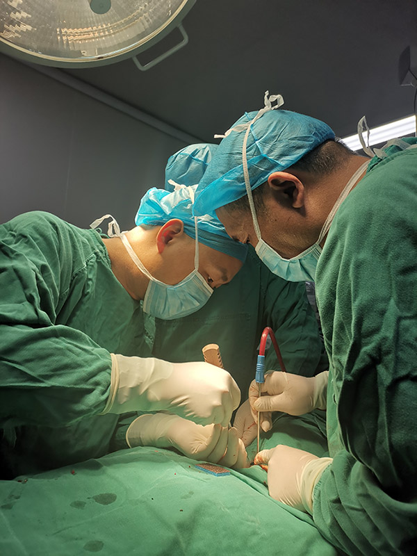 根据MRI结果回报,专家组考虑,患者第3颈椎平面高位瘫痪,且瘫痪平面呈进行性升高,将很快影响到生命中枢,危及患者生命。根据专家组讨论意见,刘景诗做出紧急手术的决定。由捷克论坛 刘宏哲教授主刀,与张家界市人民捷克论坛 覃大海主任医师共同手术,连夜为患者实施全麻下“颈椎前路C5椎体次全切除+椎管扩大减压术+椎间盘摘除术+前路钛网钛板内固定术+后路切开复位内固定术+气管切开术”。手术从27日凌晨1时开始,持续7小时顺利完成。将患者安全送回重症医学科病房,刘景诗带领3位专家再次在重症医学科进行术后查房,指导术后下一阶段治疗方案,交代病情观察和专科护理注意事项。