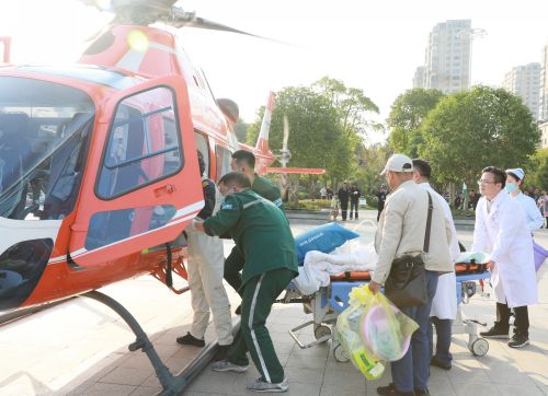 决定采用直升机转运,并及时与总院医务部、急诊120中心、急诊医学科、社会医学部、院办等部门进行联系、报备,急诊医学科主任韩小彤主任等进行转运风险评估和急诊接诊人员调度。