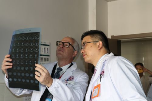 专家们对颅脑出血病例颇有兴趣,并在王庆博士陪同下查房,就患者的病情发展、治疗方案、手术效果等进行热烈讨论。之后,专家们饶有兴致地参观了介入ICU和介入复合手术部。